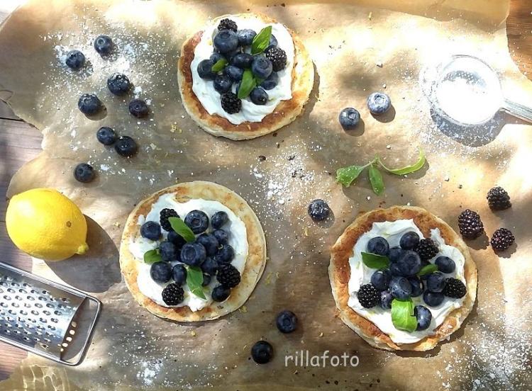 7. A krémbe ültetem az áfonyát és a szedreket, 2-3 bazsalikomlevéllel tűzdelem és citromhéjat reszelek a tetejére.