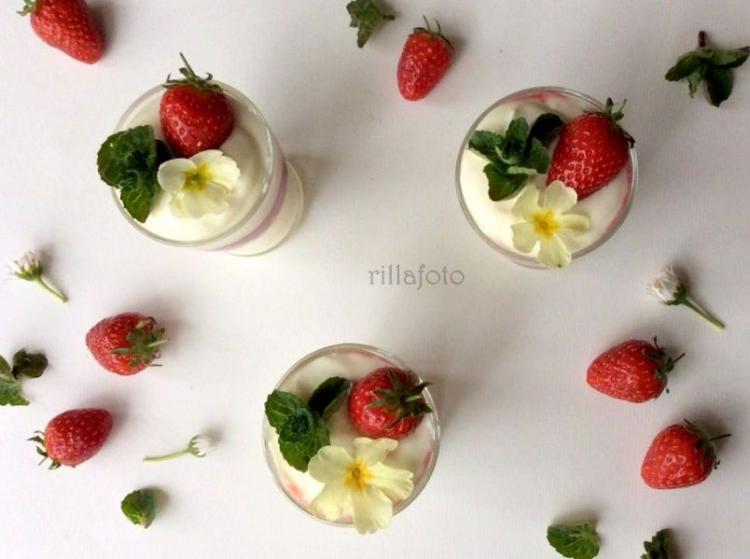 4. Tálalhatom kisebb üvegpoharakba, kelyhekbe, de szép csészékben is: A krémből töltök az aljára, majd egy rétegben elosztom a fűszeres epret, végül a krém maradéka következik. A tetejét a félretett eper szemekkel, menta levelekkel, ehető virágokkal díszítem.