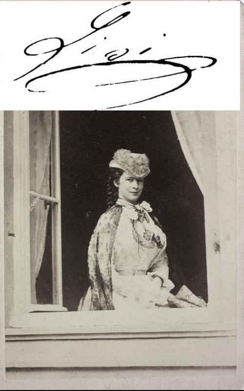Erzsébet becenevének saját kezű aláírása. A kutatók kétféleképpen olvassák: Lisinek és Sisinek. A család valószínűleg mindkét becenevet használta, legalábbis a királyné édesapja, Miksa bajor herceg mindenképpen. Ő ugyanis hívta többször a lányát Lisinek is. (A Lisi becenévről bővebben lentebb olvashatnak!) Erzsébet Joseph Albert, müncheni fotós felvételén 1865-ben. A fotózás idején Sisi bajor családja körében tartózkodott. Láthatjuk, hogy mosolyog. A képre rátettem Erzsébet aláírását (ez nem része az eredeti fotónak.) Kép: © Osztrák Nemzeti Könyvtár, No.: ÖNB Pf 6639 E (13/2)