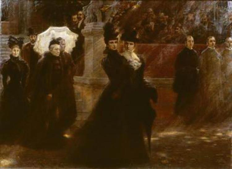 Márk Lajos kép: Erzsébet királyné 1897 októberében járt utoljára Magyarországon. Márk Lajos festménye erre az alkalomra emlékeztet: Erzsébet királyné és Gizella főhercegnő a városligeti Royal Gerbeaud pavilon előtt; festményről készített olajnyomat, keretben. A festményen a királyné mögött látható Ferenczy Ida és Festetics Mária.