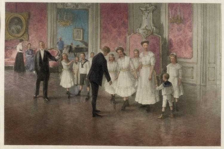 Ferenc József császár meglátogatja unokáját, Seefried grófnét (Erzsébetet) és családját (1905). A képen láthatjátok az "első" Erzsébet nevű unokától származó négy dédunokát is. © Sotheby's / akg-images