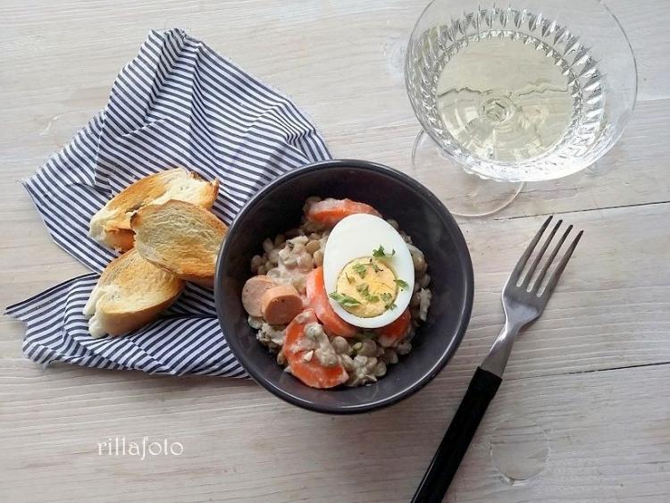 2. Leöblítem a lencsét, lábosba teszem a kis fej egész hagymával, a megtisztított, egészben hagyott sárgarépával, 1 evőkanál sóval, babérlevéllel. Felöntöm vízzel, hogy kb. 3 ujjnyira ellepje, és jó félóra-negyven perc alatt puhára főzöm. Ez a lencse fajtájától is függ, de ha beáztattam, akkor is kevesebb víz kell és hamarabb megfő, legjobb, ha időnként megnézem, megkóstolom. Ne főjön szét, ne égjen le! :)