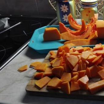 1. Meghámozom a sütőtököt, majd vékony darabokra vágom. A feltét megengedi, hogy vékony tésztaalapot készítsek, ezért a bekevert masszát egyenlően elosztva két tepsibe öntöm, amit sütőpapírral bélelek ki.