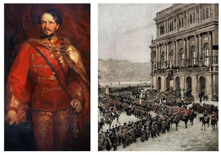 Alábbi képek: 1. Andrássy Gyula gróf. Vajda Zsigmond festménye (1887) Benczúr Gyula után. 2. Andrássy Gyula gróf temetése – a menet elindulása az Akadémiáról. Ellinger Ede pillanatfelvétele. (Az újságillusztráció utólag színezve lett.)