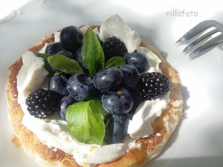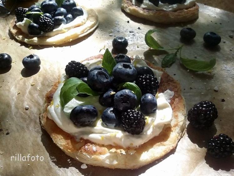 A szépszínű gyümölcsöket hófehér krémmel párosítottam, és leveles tészta alapra halmoztam. Higgyétek el, ennyi is a recept, negyedóra alatt kész az egész!