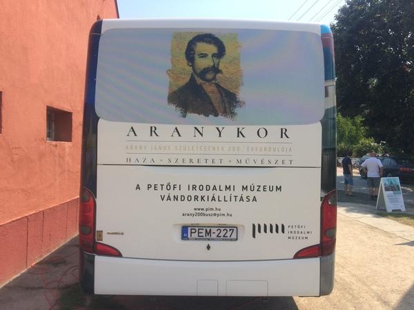 Szombat délután, aranyló napfény, a hőmérséklet jócskán túllépte a harminc fokot, mégis sok ember sétál Kémes utcáin. Mi innen kezdtük felderíteni a Bőköz Fesztivált olyan módon, hogy a lehető legváltozatosabb programokon vehessünk részt. Először a falu főterétől nem messze elhelyezkedő „Arany Buszt” látogatuk meg. A Petőfi Múzeum népszerű utazókiállítása nagy sikert aratott már az országhatárokon belül, és itt, Kémesen is nagyon sok látogatót vonzott. Az interaktivitás jelszavával mi is „jegyet” váltottunk a járműre, hogy megtekinthessünk az idén 200 éve született író életpályáját. Láthattunk itt digitális, interaktív idővonalat, csodálatos, fára kidolgozott Arany-verseket, tesztelhettük tudásunkat a költő szókincsével kapcsolatban, és meghallgathattunk jónéhányat a megzenésített Arany-művek közül. A bátrabbak pedig a busz előtt belebújhattak Toldi Miklós bőrébe petrencés rudak és sisakok segítségével.