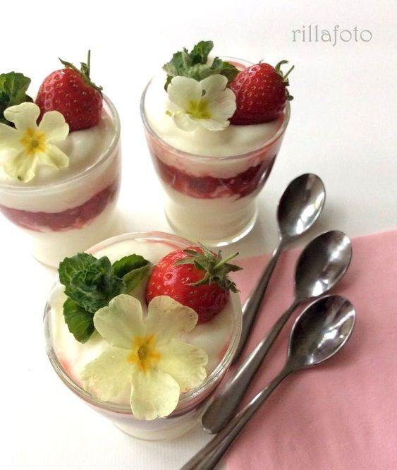4. Tálalhatom kisebb üvegpoharakba, kelyhekbe, de szép csészékben is: A krémből töltök az aljára, majd egy rétegben elosztom a fűszeres epret, végül a krém maradéka következik. A tetejét a félretett eper szemekkel, menta levelekkel, ehető virágokkal díszítem.