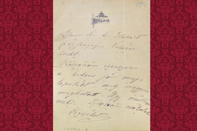 Erzsébet magyarul írt levele Mária Valériához. Az utolsó előtti sorban középen (Szívből) megfigyelhető, hogy a királyné - ahogy a Sisi becenévnél (fentebbi kép) is a Z-hez hasonlóan írja az S-t. Az aláírásban is látható, egy -z. (A bordó tapéta nem része a tételnek.) © Dorotheum Lot No. 130
