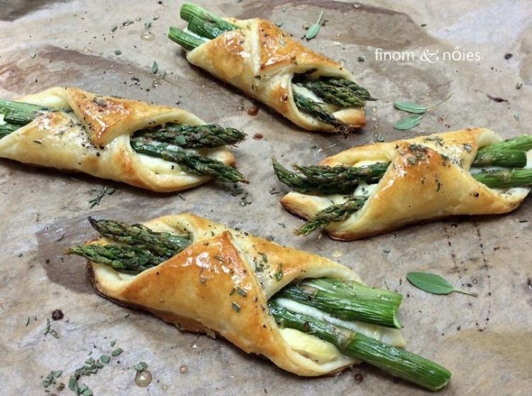 3. A tésztanégyzetekre átlósan 1-1 sajtot helyezek, és elosztom rajtuk a spárgát, nekem 3-3 darab jutott.