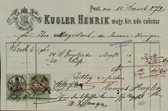 Kugler Henrik cukrász számlája (1872. december 15.) – forrás: Magyar Nemzeti Levéltár