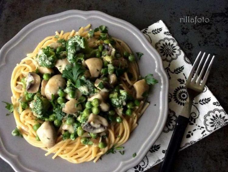 Hóesésben pedig kizárólag meleg, téli ételekre vágyom, így aztán egy jó kis tejszínes spagettinél kötöttem ki. Hogy a tavaszi vonal mégis megjelenjen, sok-sok zöld színt használtam benne, és végül egy marék medvehagymával is megdobtam.