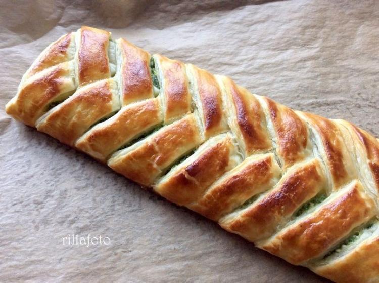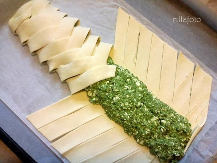 7. A tölteléket a közepére halmozom púposan, és a bevágott széleket felváltva jobbról-balról ráhajtogatom a közepére, nem kell húzni, csak ráfektetni, ettől lesz fonott hatású.