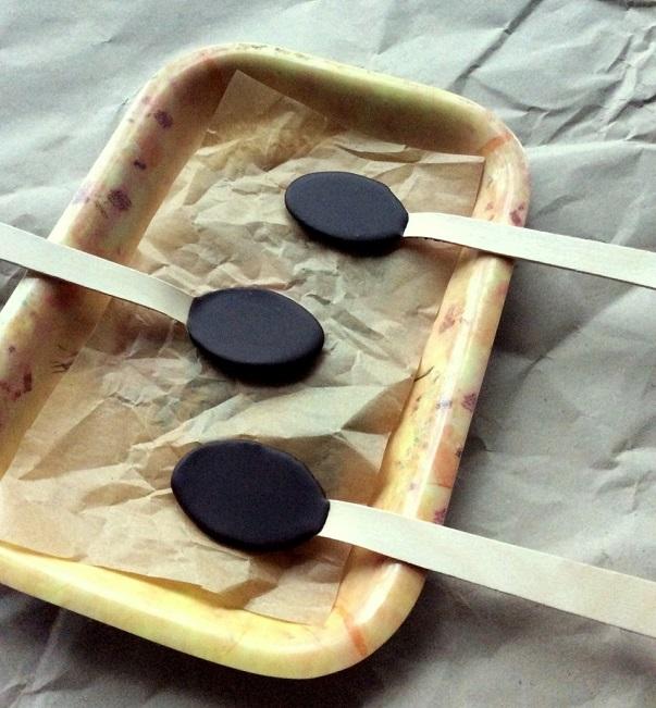 2. Az étcsokoládéval jól megmártom a kanalakat, és sütőpapírral bélelt tálcára teszem dermedni. A kanál nyele a tálca peremén legyen, hogy minél kevésbé folyjon ki a csoki belőle. Hideg levegőn (terasz, erkély, ablak) pár perc alatt megszilárdul.