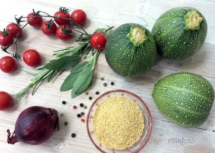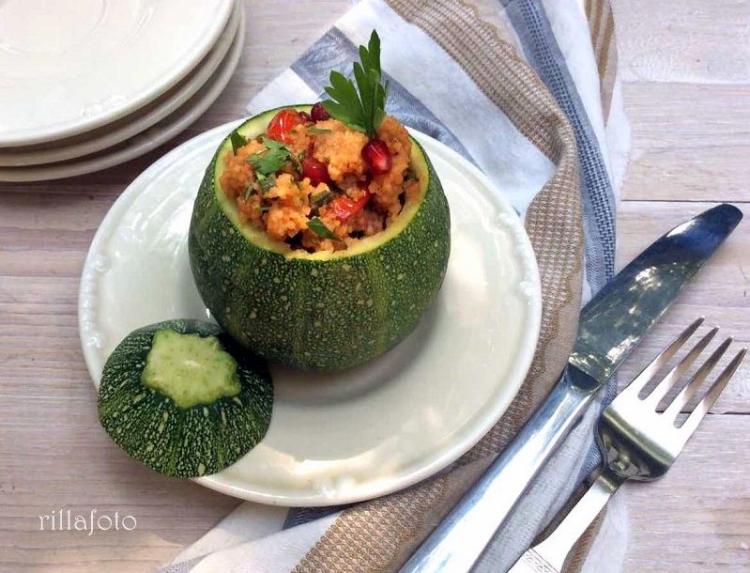 6. Végül összekeverem a kuszkusszal, a petrezselyemmel és a gránátalma magokkal. Az így elkészült tölteléket betöltöm a cukkinihéjakba.