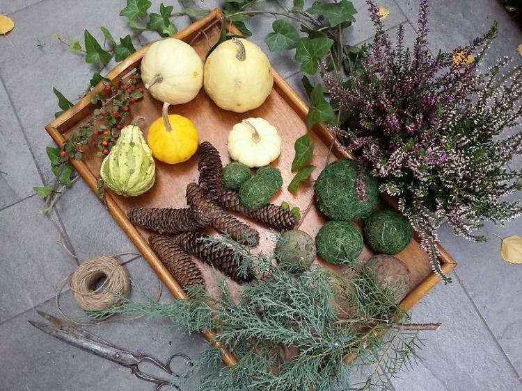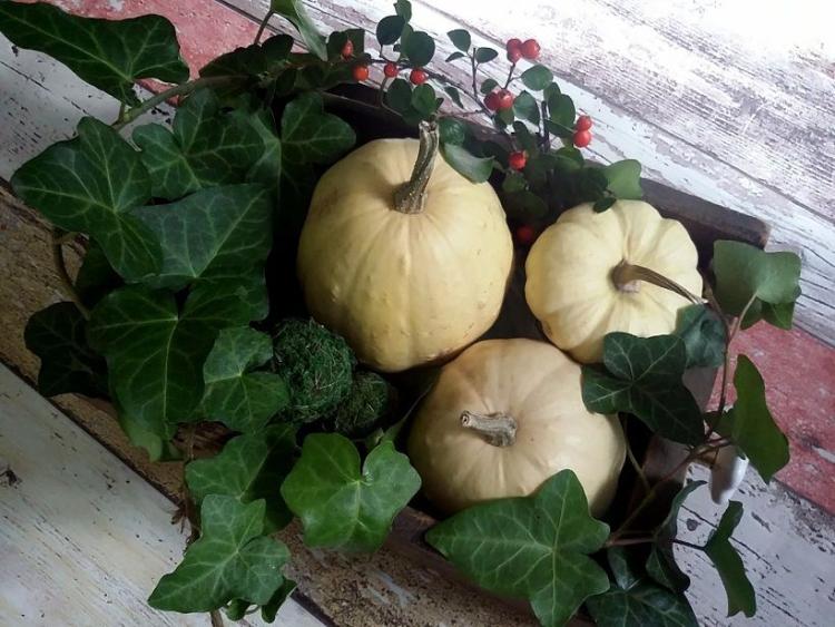 Helyezz el a tálcán 1-2 cserép őszi virágot, kaspóban vagy csak alátéttel, hogy öntözni is tudd. Kerítsd körbe a tálcát jó sűrűn borostyánnal, ügyelj rá, hogy a szélén is szépen feküdjön.