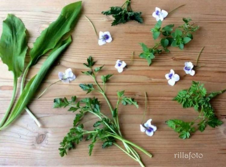 egy maréknyi zöldfűszer (balról lefelé haladva a képen): medvehagyma, petrezselyem, zamatos turbolya, tyúkhúr, csalánhajtás, vagy amit szeretünk