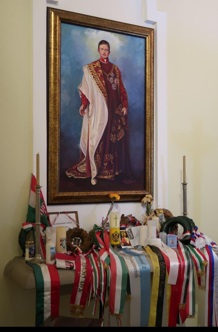 Monte temploma Funchal, Madeira fővárosa felett, egy hegyen található. Túrázni is lehet, de mivel szokásom beöltözve látogatni a Habsburgok emlékhelyeit, így bérelt autóval mentünk fel, ameddig lehetett. Nagyon szép a templom, és Károly sírhelye, magyar koszorúk, zászlók emlékeztetnek bennünket magyar királyunkra.