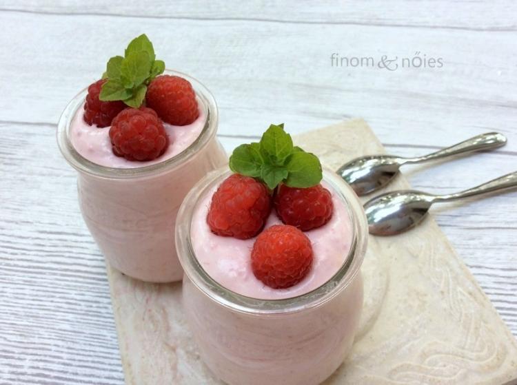 A tejszínt nagyon jól fel lehet verni a joghurttal és a málnával együtt. Ha teszünk bele zseléfixet, akkor később kissé meg is szilárdul a pohárban, ha nem, akkor lágyabb krém marad.