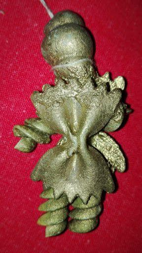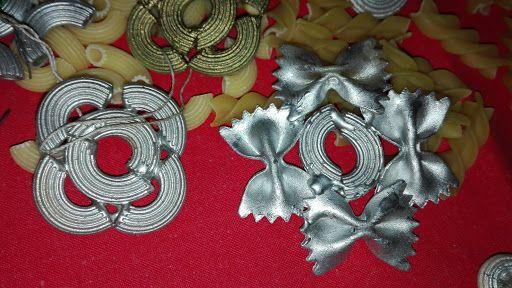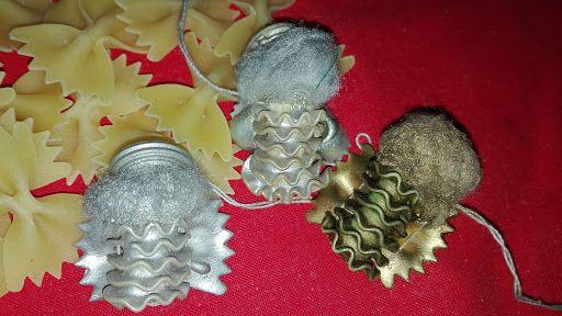Az alábbi képen száraz tésztából készített díszek vannak. Kell hozzá 4-5 féle különböző formájú tészta, erős ragasztó, festék (szórófejes), valamint cérna a fára való felakasztáshoz (például vattapamacsot is használhatunk az angyalkák fejének). A tészták alakjának megfelelően kreatívan próbálkozhatunk a különböző formák kialakításával. Ügyeljünk arra, hogy a ragasztó milyenségének megfelelően várjuk ki a száradási időt, s inkább másnap fessük be. A szórófejes festékkel mindenféleképpen szabadban dolgozzunk.