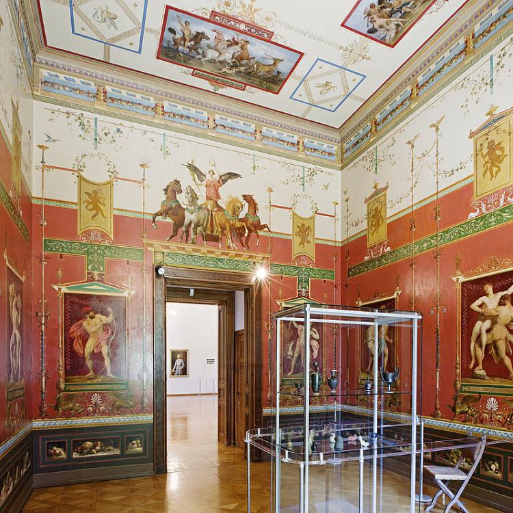 Elisabeth’s gymnastic room in Hermes Villa. The wall paintings of that room were made by August Eisenmenger, Hugo Charlemont and Adolf Falkenstein imitate models from Pompei. Photo by Hertha Hurnaus © Wien Museum