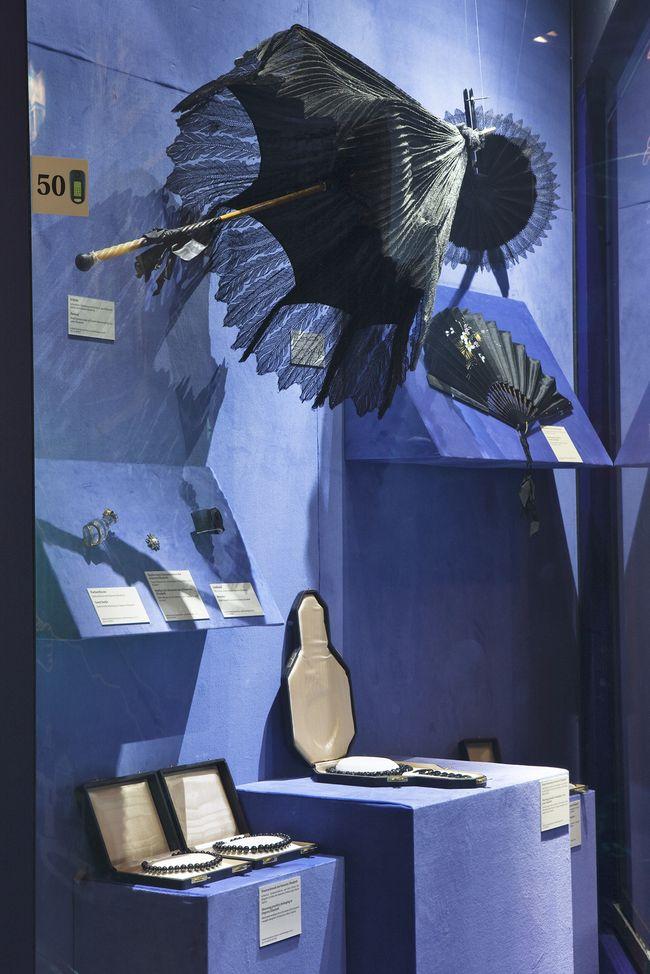 Udvari gyász: Erzsébet gyász idején viselt napernyője, gyászékszerek. Sisi Múzeum, Bécs © Schloß Schönbrunn Kultur- und Betriebsges.m.b.H. / Louis Lammerhuber