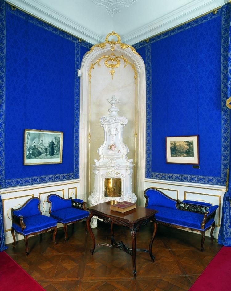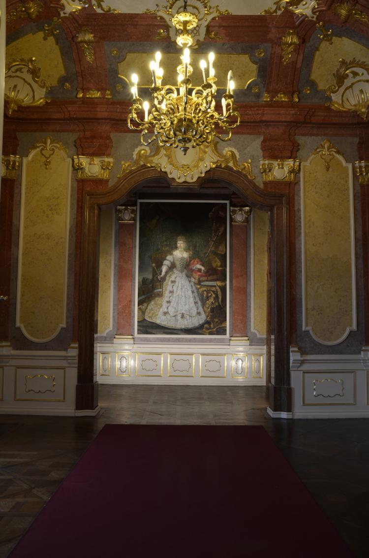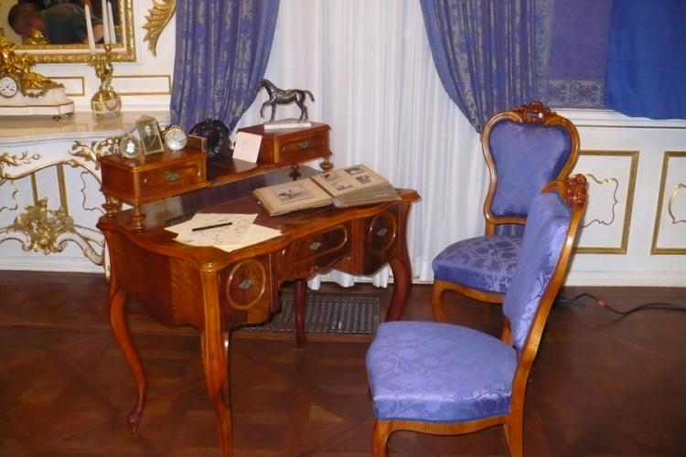 Erzsébet írószobája a Gödöllői Királyi Kastélyban. Két írószobának elnevezett terme is van Erzsébet lakosztályának. A fenti az író- és öltözőszoba, a lenti az írószoba. A fürdőszoba feltételezett helye a fenti, író- és öltözőszobában van. A lenti helyiségből (írószoba) nyílik ez az öltözőszoba, abból pedig a királyné márvány borítású hálószobája. (A lenti írószoba a királyné szalonjából nyílik, amely pedig a Díszteremből. A Díszterem másik oldalán a király lakosztálya található. Bővebben a királyi lakosztályokról: ITT) © Gödöllői Királyi Kastély