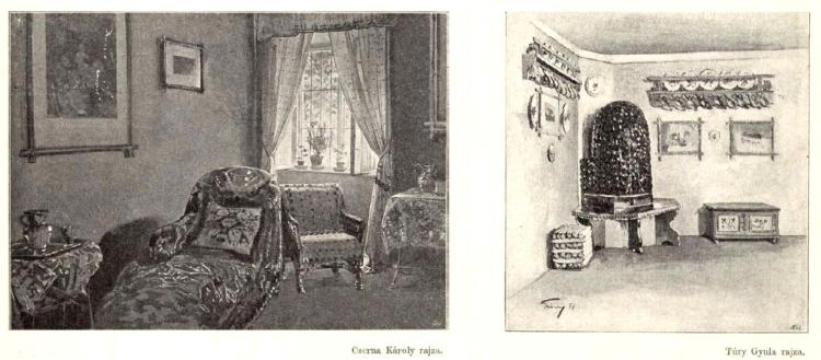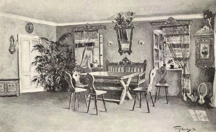 Nem hiányzik a faláda, valamint a padka sem, melyen belül a búbos kemencze terpeszkedik, nem agyagból tapasztott s fehérre meszelt kemencze ugyan, hanem egy fényes, fekete golyó-alakú cseréplemezekből rakott kályha. A pohárszék [poharak tárolására alkalmas faragott bútor] nagyon oda illik ehhez a szomszédsághoz, s még inkább, ha az ember felnyitja és a benne levő csinos edény- és üveg-készletet szemügyre veszi. A közeli sarokban egy egyszerű fehér kampósbot áll, a házi aszszony tulajdona. A másik sarok szögletében egy kis fali szekrény van, melynek ajtajára egy cserépkorsóban álló természetes nagyságú, igen sikerült tulipánbokréta van festve. E szekrény alatt kancsók közt egy csapra ütött hordócska áll. A szekrény fölött a virágokkal és barkákkal díszített feszületet látjuk. A tükör mögé pávatoll-bokréta van illesztve. Odább egy schwarzwaldi [Fekete-erdei] fali óra ketyeg, melyre magyar rózsákat festettek. És az ajtófélen még a naptár is ott lóg egy hatalmas kulacs mellett. Az ajtó mellett nem hiányzik a szenteltvíztartó sem, mely fölé olvasót akasztottak. Az ajtó szemöldökfáján és az ablak-rámán egy-egy kitömött fecske ül; úgy tetszik mintha most repültek volna a szobába. Valóságos eleven szoba ez, melynek berendezése nem a bútorkereskedő kezéből került ki.