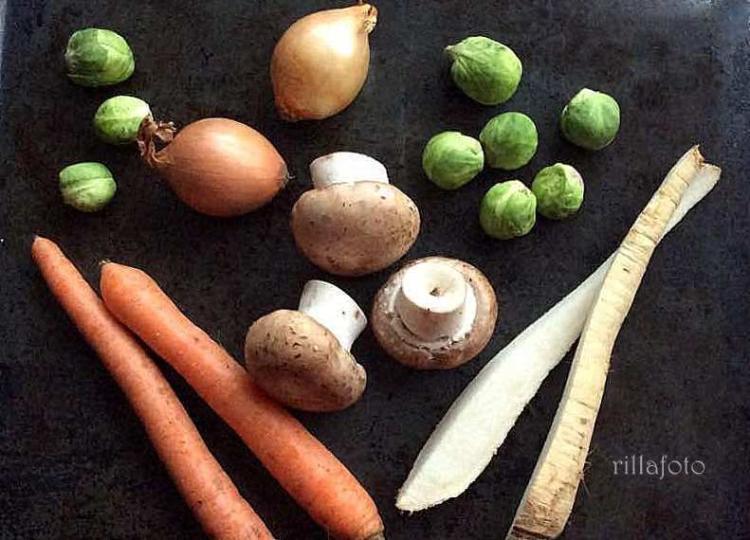 2. Megtisztítom és felkarikázom a répákat, ezt is hozzáteszem, továbbra is kevergetem, le ne kapjon, majd jöhet a kelbimbó, végül a megmosott, nyolcadokra vágott gomba. Ezzel már csak óvatosan rázogatom pár percig, ne törjön össze a puhuló zöldség.