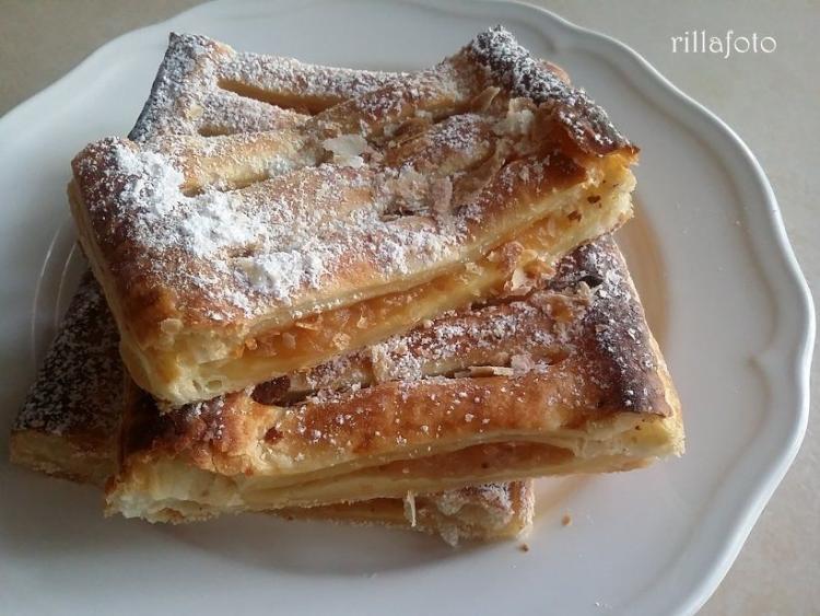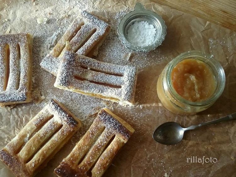 3. A keskenyebb tésztán elosztom a pudingot úgy, hogy körben 1-1 centit üresen hagyok, és a tetejére halmozom az almatölteléket.
