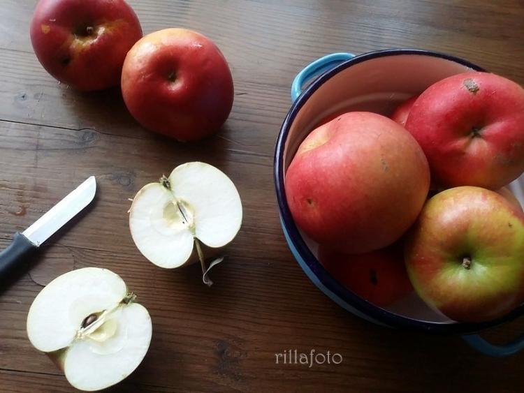 A „bio” almáinkat állandóan ellenőrizni kell, és bizony időről időre van közte 10-15 darab, ami nem tárolható tovább. Ezekből gyors almatölteléket szoktam készíteni, amit pitébe, palacsintába teszünk egész télen.