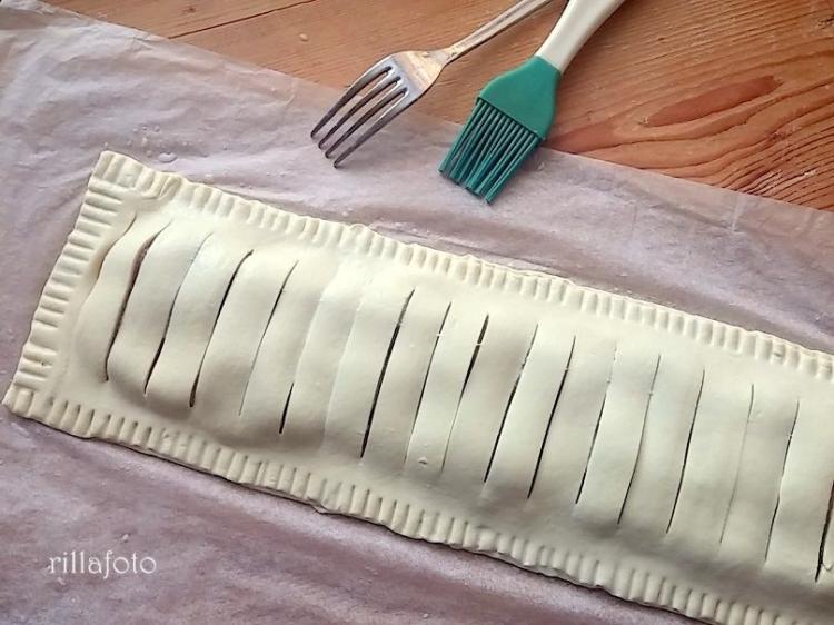 4. A szélesebb lapot bevagdalom (lásd a fotót), majd ráhelyezem a töltelékesre.