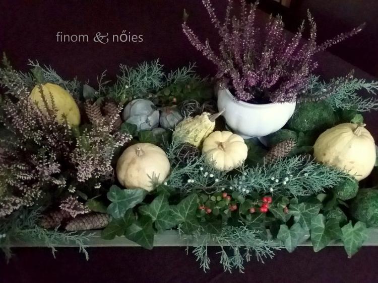 Helyezz el a tálcán 1-2 cserép őszi virágot, kaspóban vagy csak alátéttel, hogy öntözni is tudd. Kerítsd körbe a tálcát jó sűrűn borostyánnal, ügyelj rá, hogy a szélén is szépen feküdjön.