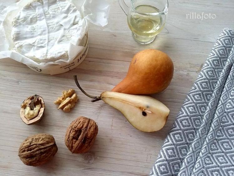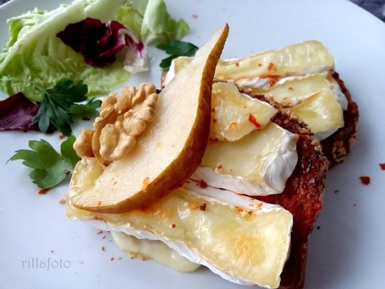 5. Míg sül, elkészítem a salátát: pár salátalevelet teszek a tányérra, mellé körteszeleteket és diót. Öntet nem szükséges, a szendvics elég krémes lesz.