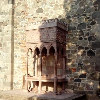 Királyi Palota – 1. kerengő a Herkules-kút rekonstrukciójával (az eredeti, amelynek elég sok darabja megmaradt, helyreállítva szintén megtekinthető az egyik kiállítóteremben); 2. lakószoba; 3. cserépkályha; 3. gyümölcsöskert; 4. a kerengő egy bejárata; 5. az oroszlános kút rekonstrukciója (az eredeti darabjai is megtekinthetők).