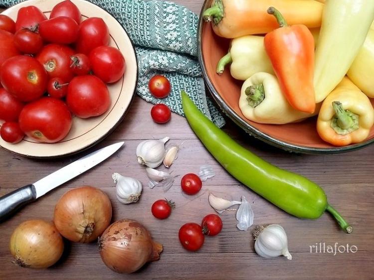 peperonata: olívaolaj, piros, sárga és zöld színű paprikák, fokhagyma és bazsalikom, olajbogyó, kapribogyó
