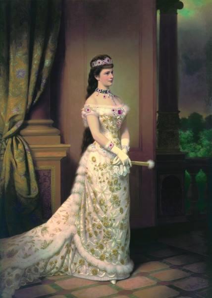 The picture below was painted by Georg Raab for the 25th (silver) wedding anniversary of the imperial couple. It was a special occasion: Elisabeth appeared in public (that time she already avoided nearly every representative duty). It was the very last portrait that Elisabeth seated. (She did not allow any photo taken of her, or did not seated any of the paintings that time.)