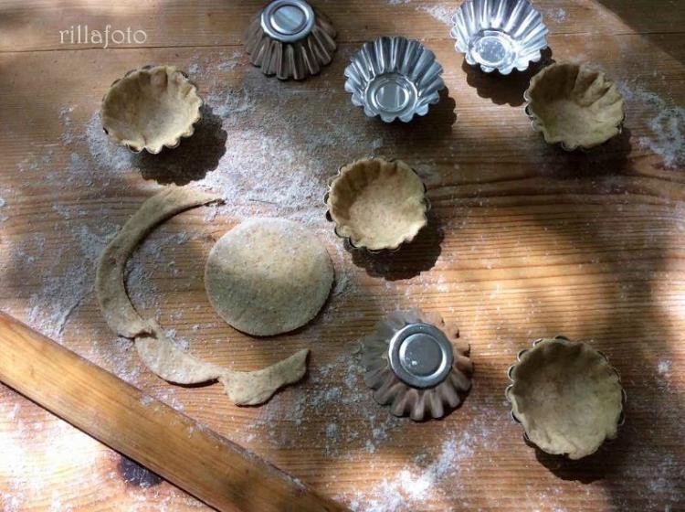 4. A tésztát lisztezett deszkán vékonyra nyújtom, a formáknál kicsit nagyobb köröket szaggatok belőle, és kibélelem velük a kosárkákat.