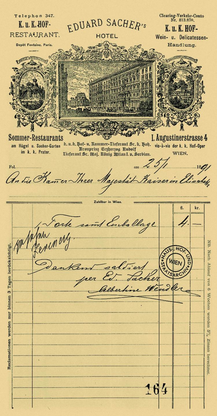 A birodalmi fővárosban, Bécsben is voltak Erzsébet császárnénak kedvenc helyei, ez persze nem jelentette azt, hogy ezekben a cukrászdákban, kávéházakban személyesen is megfordult, hanem jellemzőbb volt, hogy rendeltek az udvar számára. Több fennmaradt számla bizonyítja ezt, például a következő, a híres Sachertől, ahol természetesen Sacher tortát rendeltek; az aláírás is jól olvasható: Ferenczy Ida.