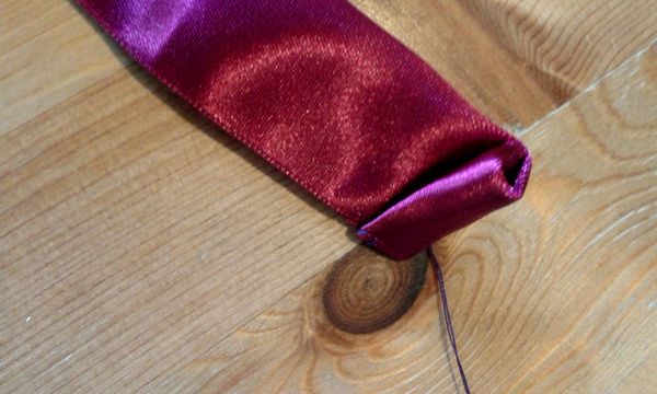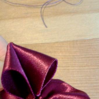 A rózsa elkészítésének mindössze annyi a titka, hogy a hosszú, széles selyemszalagot először félbe hajtjuk (a fényes fele legyen kívül), majd az egyik végén kissé behajtjuk a foszlós résznél, kicsit odavarrjuk alul, majd az egészet elkezdjük befelé hajtogatni. Hajtogatás, varrás-rögzítés. Közben úgy hajtjuk, hogy nyíló rózsa forma bontakozzon ki. Rá fogunk jönni, miközben csináljuk, mennyire egyszerű :)