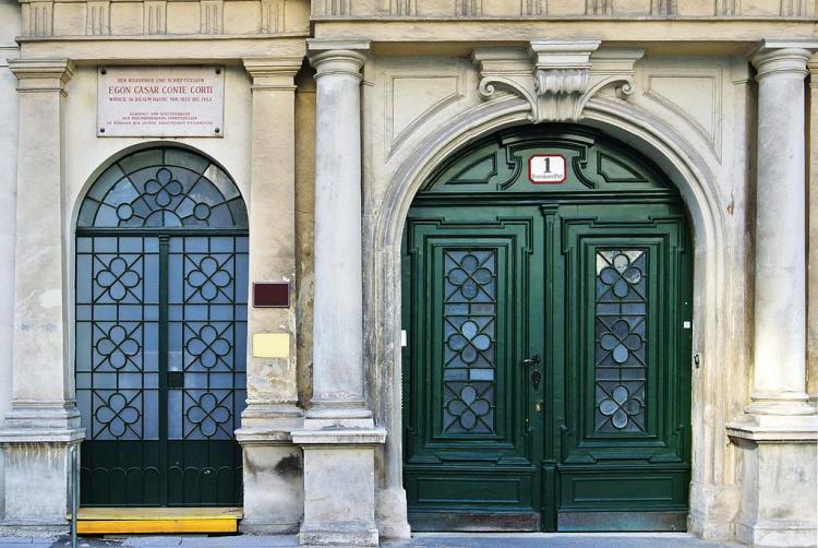 Corti gróf és felesége bécsi háza (a falon emléktáblával), Franziskanerplatz 1. (Forrás: Herbert Josl)