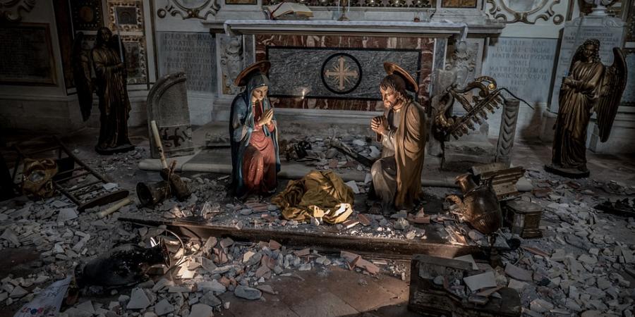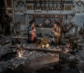 A félig leszakadt ajtót félrehúzva beléptek a templomba. Égett gerendák, megroggyant padok között haladtak a szentély felé. Az oltár fölött ülő fej nélküli Mária szobor még mindig ölelésre tárta karjait, szinte hívta a két katonát. A hadnagy térdre borult, a sérült szobrot nézte. Magában számolgatva döbbent rá, hogy egyrészt karácsony van, másrészt lehet, hogy már megszületett a gyermeke.