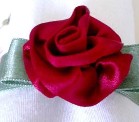 Nagyon könnyű, de kissé időigényes kisrózsákat készíteni selyemszalagból. Az alábbi kreációhoz még különösebb varrótehetség sem szükséges, hiszen a varrást szépen el tudjuk tüntetni, így nem is látszik. Egy, a képen látható kisrózsa elkészítése nekem 20-23 percet szokott igénybe venni, a hozzá tartozó levél és gyűrű elkészítésével együtt. Azért írom azt, hogy „szokott”, mert eddig körülbelül 150-et készítettem már belőle: Az esküvőnk alkalmából több mint 100 darabot, illetve néhány szerettemnek is egy-egy szettet.